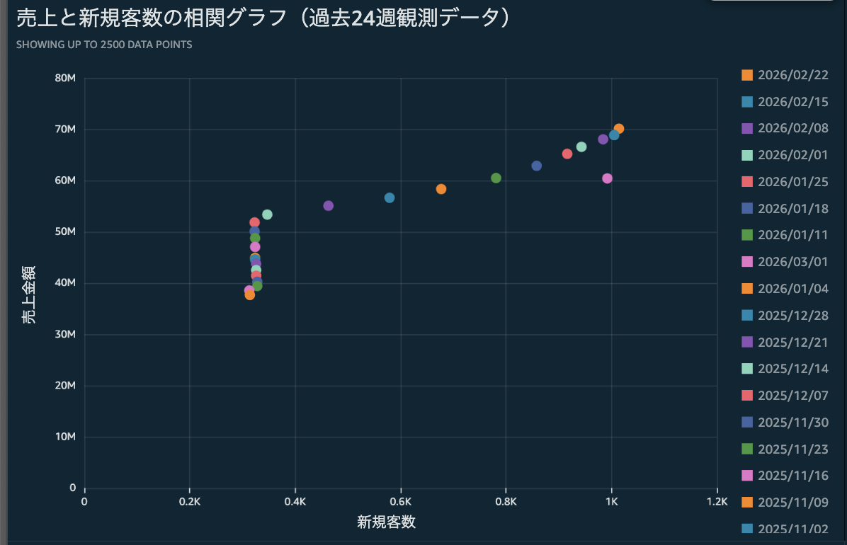 散布図グラフは、設定したActive期間を対象として、過去24週の集計日での数値を利用して描画されます。